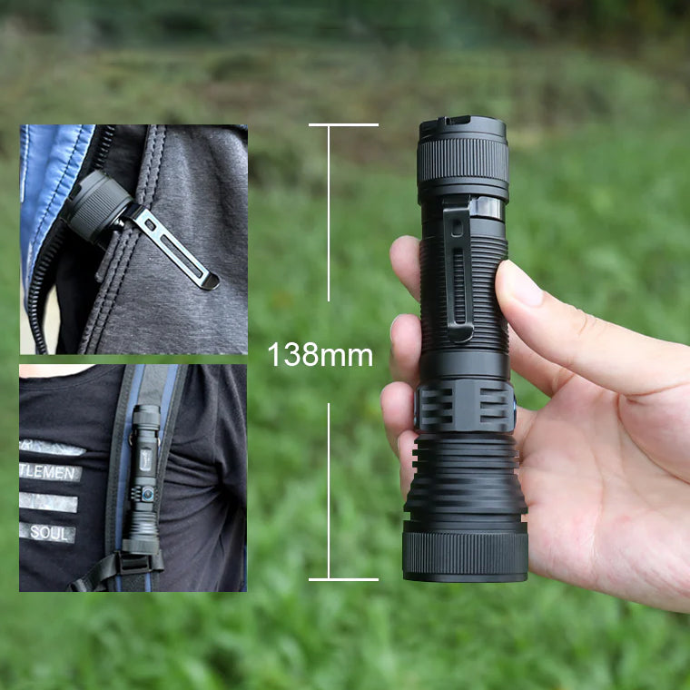 Rendimiento impresionante con 1500 lúmenes y un alcance de 550 luces Con una asombrosa potencia de salida de 1500 lúmenes y un alcance de haz de hasta 550 metros, esta luz garantiza una iluminación amplia y de largo alcance. Es perfecta para actividades al aire libre, operaciones de búsqueda y rescate o cualquier situación en la que sea crucial una iluminación potente y de largo alcance.