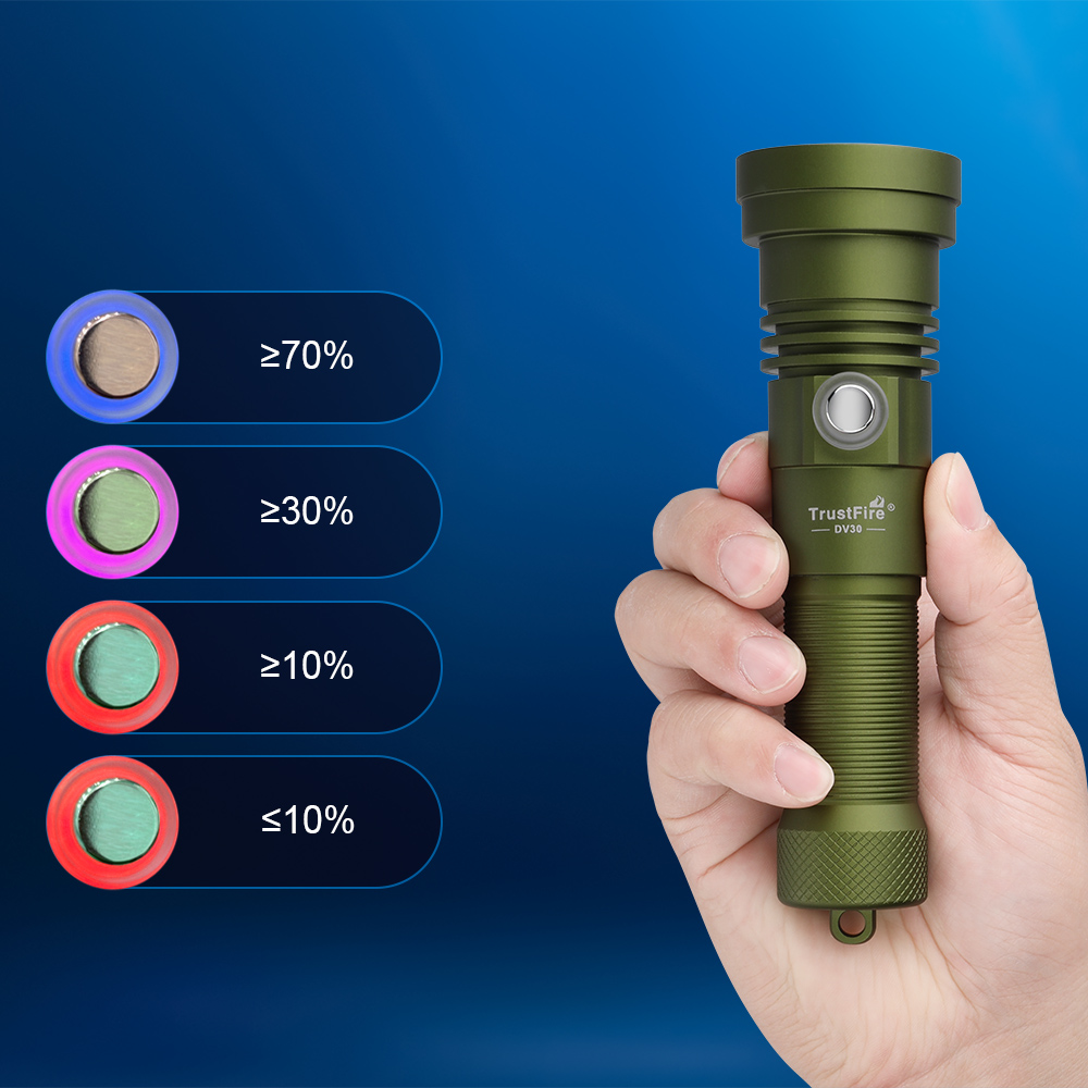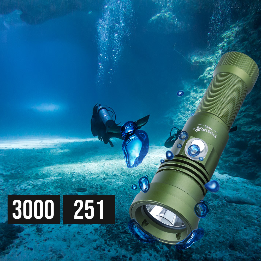 La DV30 es una pequeña linterna de buceo con una profundidad máxima de 251 metros, un brillo máximo de 3000 lúmenes y un alcance máximo de 480 metros.
