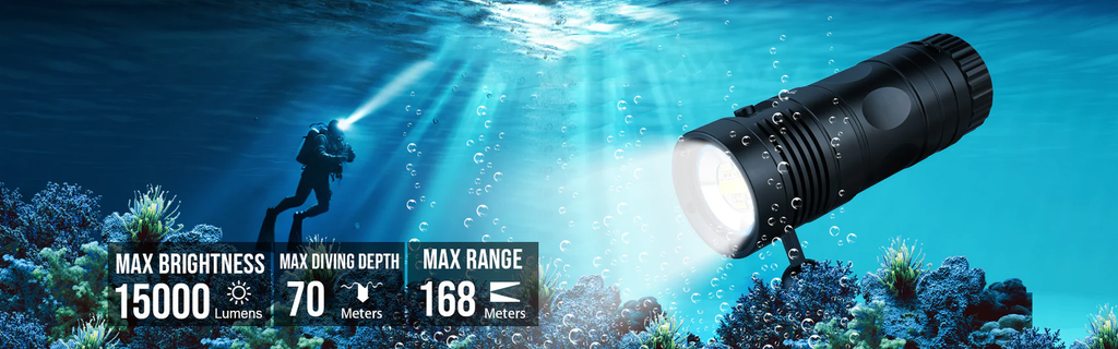 2. En la temperatura del agua de mar, debido a la disipación de calor auxiliar del agua de mar, la duración de la batería con el brillo más alto es de aproximadamente 55 minutos cuando se mide en agua de mar a 25 grados. Utilice el modo intermedio cuando bucee durante un tiempo prolongado.