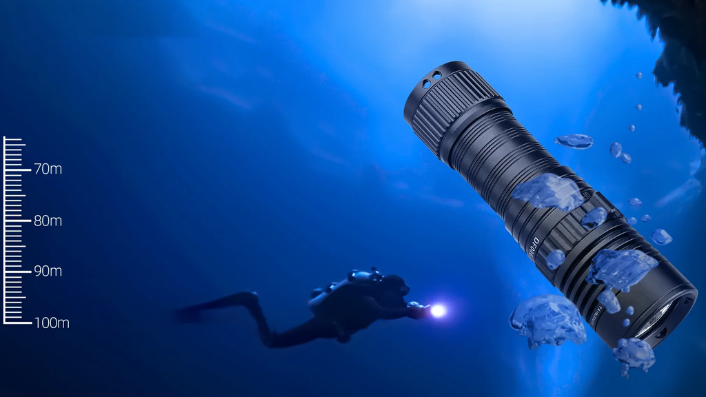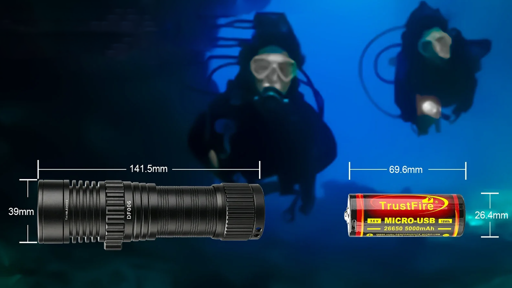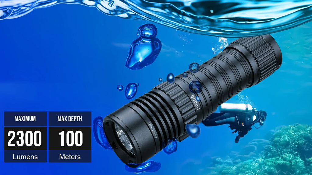 DF006 es una pequeña linterna de buceo que utiliza rotación magnética para controlar interruptores y engranajes. Tiene un buen rendimiento a prueba de agua, la profundidad máxima puede alcanzar los 100 metros y el brillo máximo puede alcanzar los 2300 lúmenes.