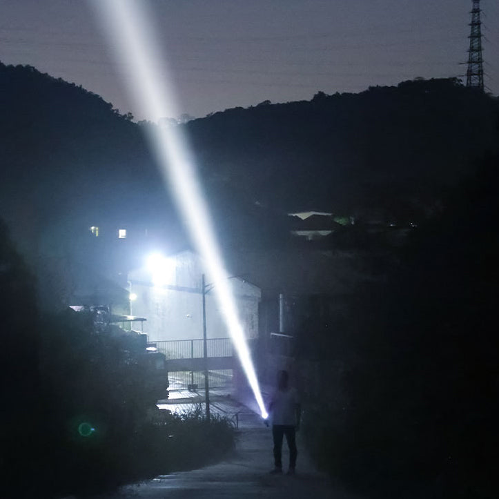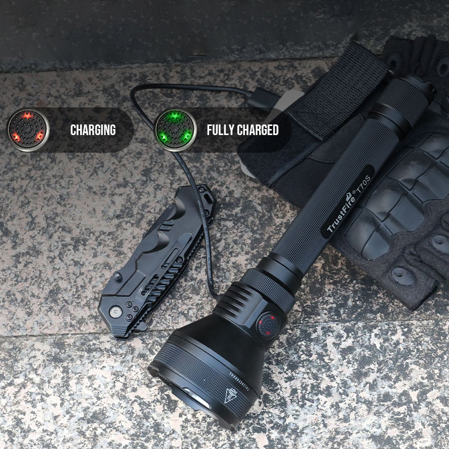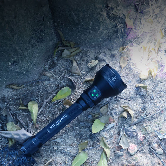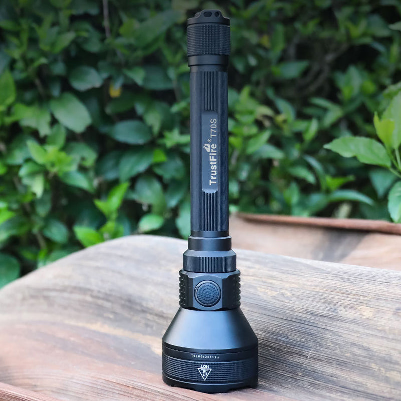 Con 2 baterías 18650, el T70S produce 23500 lúmenes de potencia de salida y 1050 metros de distancia de proyección, lo que le permite ver incluso con lluvia intensa o niebla.