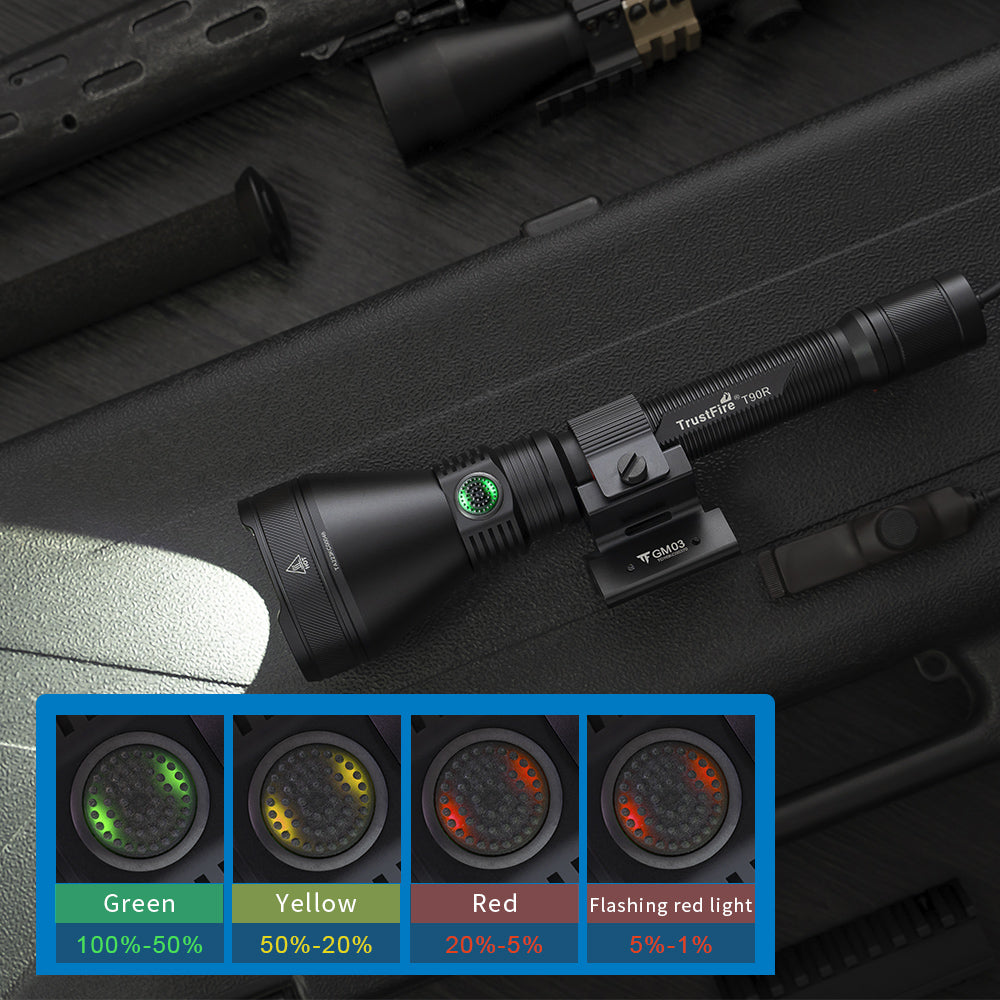 Hay una luz indicadora de batería en el cuello de la linterna. Cuando la linterna está encendida, la luz indicadora de batería se enciende y los diferentes colores representan la energía restante.
