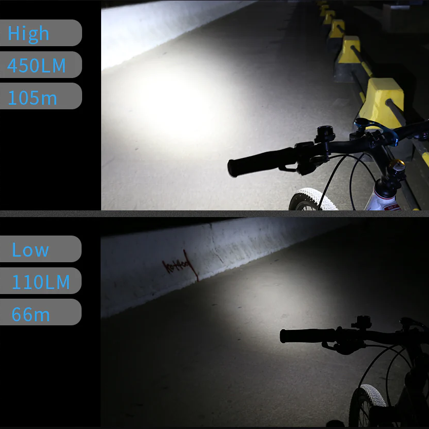 Luz para coche de bicicleta D2R, lúmenes máximos de 450 lm, alcance máximo de 105 m; lúmenes máximos de bajo brillo de 110 lm, alcance de 66 m