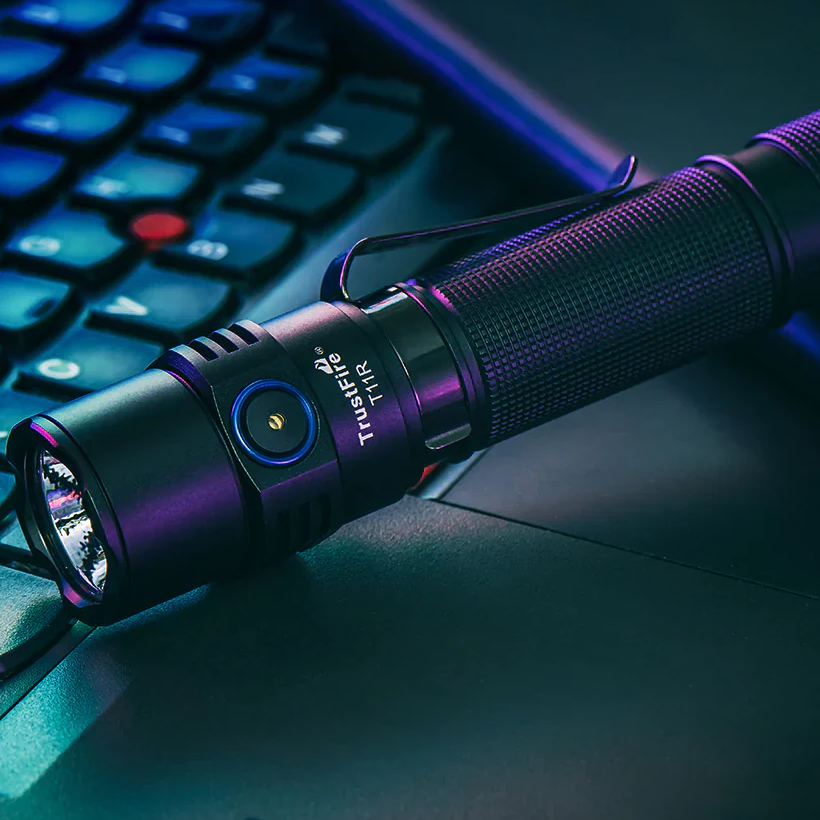 La linterna táctica T11r tiene un botón en el cuello y un botón de interruptor de cola respectivamente diseñados para mayor comodidad en su viaje.