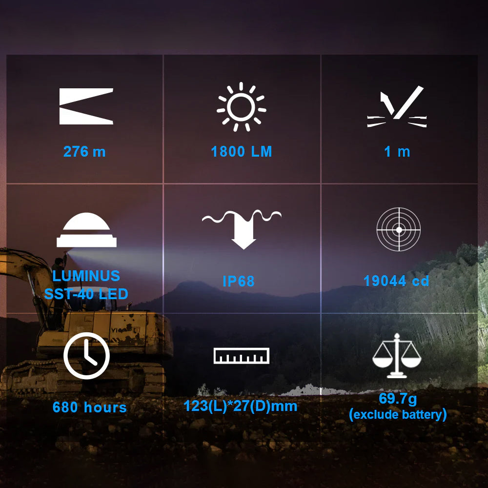 Linterna táctica recargable de alto rendimiento con un máximo de 1800 lúmenes y un alcance de 276 metros.