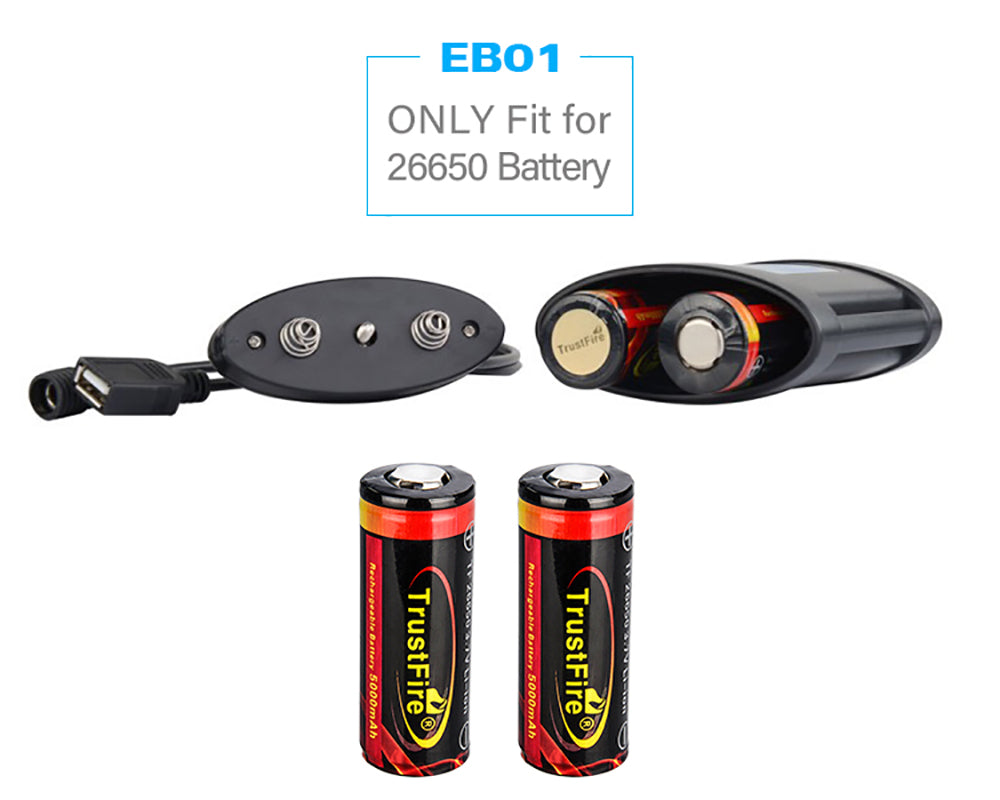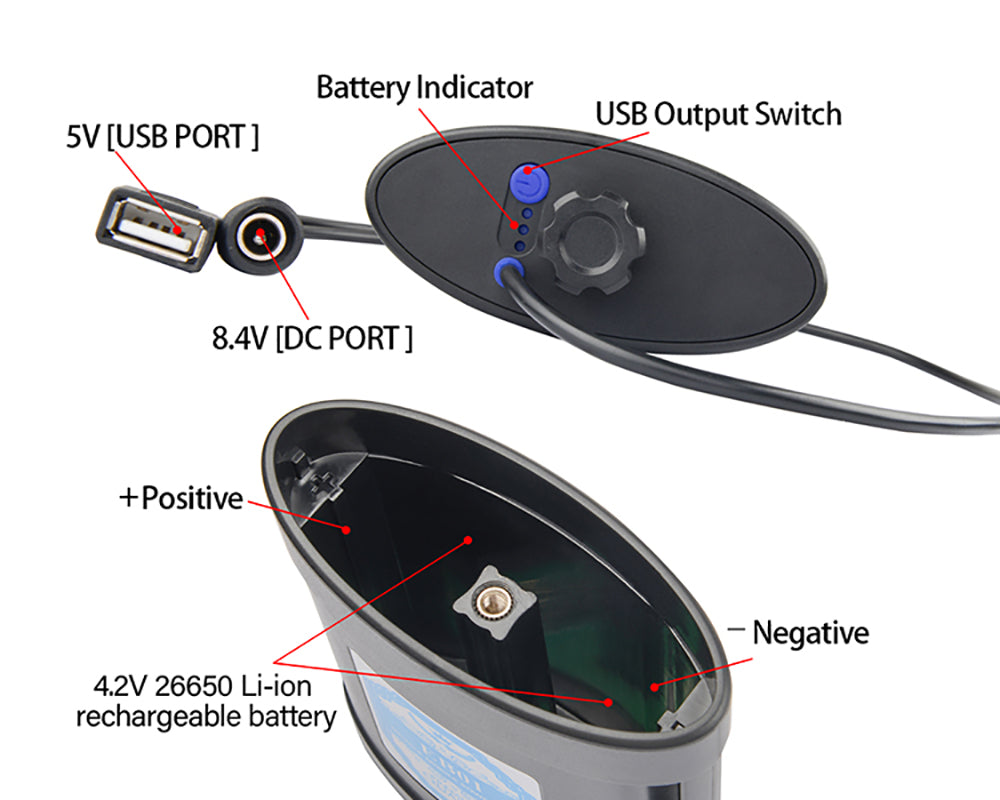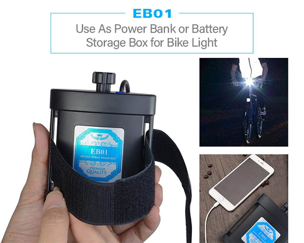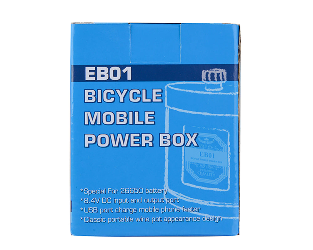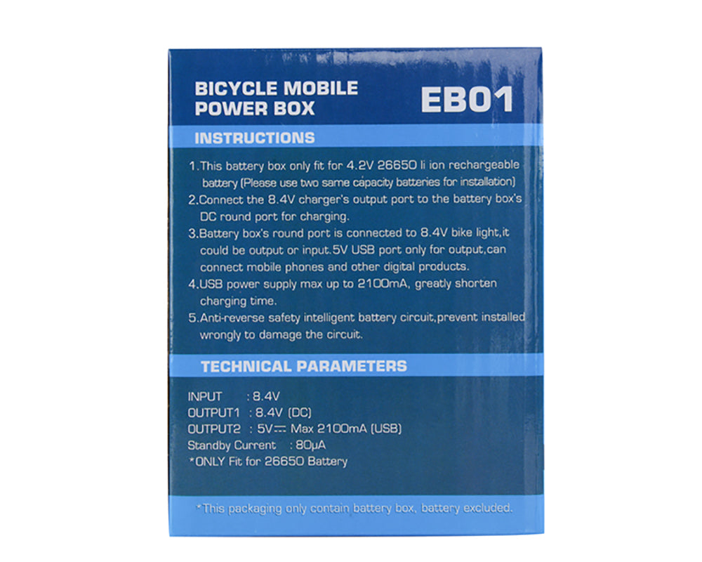 EB01 - 8.4V Estuche para batería de bicicleta de ion de litio recargable a prueba de agua Funda para casa Úselo como banco de energía o caja de almacenamiento de batería para luz de bicicleta o teléfono móvil Características Solo para 2 * batería recargable de ion de litio 26650 Entrada: 8.4V 2000mA Salida 1: Puerto CC de 8.4V 5.5 mm Salida 2: Puerto USB de 5V máx. 2100mA Corriente en espera: 80uA Grado de impermeabilidad: IP67 3 Protección: Sobrecarga Sobredescarga Sobrecorriente Diseño de forma elegante de olla de vino Consejos de instrucciones Conecte el puerto de salida del cargador de 8.4V al puerto CC de 5.5 mm de la caja de la batería para cargar. El puerto CC redondo de 5.5 mm del paquete de baterías está conectado con la luz de bicicleta de 8.4V, se puede usar como salida o entrada. El puerto USB de 5 V es solo para soporte de salida para conectar a teléfonos móviles u otros productos digitales. El paquete incluye: 1x EB01 2*26650 Estuche para batería (batería no incluida) 1x Correa 1x Manual del usuario